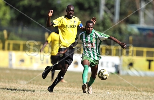 Nzoia Sugar’s Beja Hassan (R) vies for the ball with Humphrey Mieno of Tusker FC during their Football Kenya Federation match at Ruaraka grounds on January 14,2023.Photo.Sportpicha