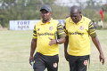 Muranga Seal FC coach Abdallah Juma (R) and an official reacts against Mara Sugar FC during their FKF Premier League match at Sportpesa Arena in Muranga County on September 29, 2024. Photo/Samwel Ogor/Sportpicha