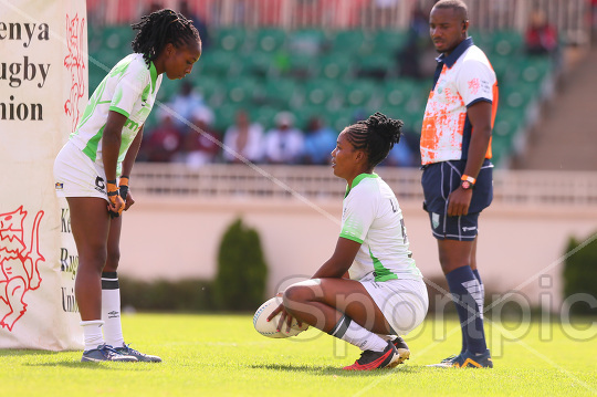 Moreen Muritu (L) and Faith Livoi of Kenya Lionesses celebrates scoring against Uganda during the 27th edition of the 2025 Safari Sevens Tournament at Nyayo National Stadium on October 11, 2025. Photo/Sportpicha