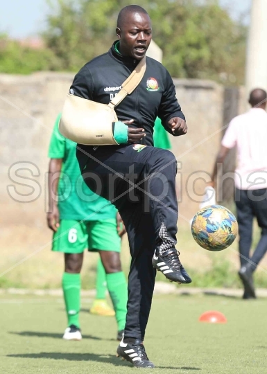 Harambee starlets coach David Ouna dribbles the ball during their training session at Camp Toyoyo stadium ahead of their first leg tie of the Olypics Qualifiers in Ghana.Photo Oliver Anandawww.sportpicha.com