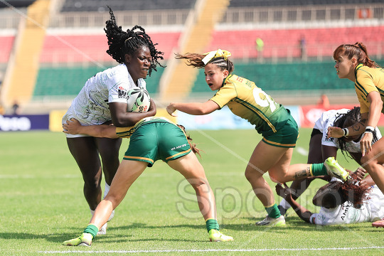 Stella Wafula (with ball) of Kenya Lioness tackled by Gabriela Lima of Brazil 7s during their 2026 HSBC SVNS 2 match at Nyayo Stadium on February 14, 2026. Kenya Lionesses won 15–12. Photo/Sportpicha