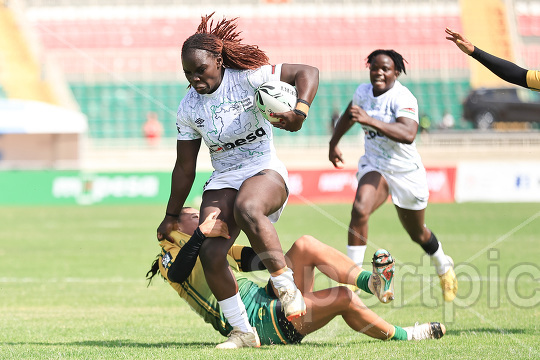 Grace Okulu (with ball) of Kenya Lioness tackled by Brazil 7s players during their 2026 HSBC SVNS 2 match at Nyayo Stadium on February 14, 2026. Kenya Lionesses won 15–12. Photo/Sportpicha