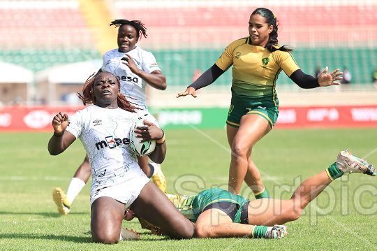 Grace Okulu (with ball) of Kenya Lioness tackled by Brazil 7s players during their 2026 HSBC SVNS 2 match at Nyayo Stadium on February 14, 2026. Kenya Lionesses won 15–12. Photo/Sportpicha