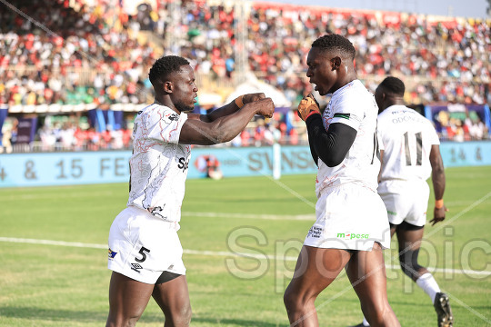 Festus Shiasi Safari (Left) and Patrick Odongo of Kenya Shujaa celebrate victory against Germany 7s during their 2026 HSBC SVNS 2 match at Nyayo Stadium on February 14, 2026. Photo/Sportpicha
