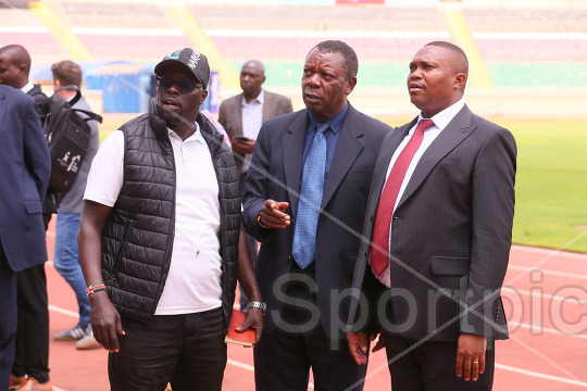Local Organizing Committee (LOC) chairperson Nicholas Musonye (Center) explains a point as Sports Kenya Director General Timothy Kiplimo (Left) and PS Sports Elijah Mwangi ahead of the first leg of the 2026 HSBC SVNS 2 tournament at Nyayo national stadium on February 11, 2026. Photo/Sportpicha at Nyayo Stadium on February 11, 2026. Photo/Sportpicha