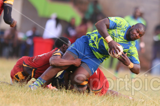 Jack Adero (with ball) of KCB Rugby tackled by KU Black Blad players during their Enterprise Cup Quarter Finals match at Lions Den, KCB Sports Club in Ruaraka, Nairobi on February 07, 2026. KCB Rugby won 60-07.Photo/Sportpicha
