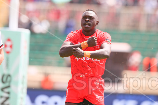 Patrick Odongo Okong'o of Kenya Shujaa celebrates scoring a try against Canada during their 2026 HSBC SVNS 2 match at Nyayo Stadium on February 14, 2026. Kenya 7s secured a 29-12 victory. Photo/Sportpicha