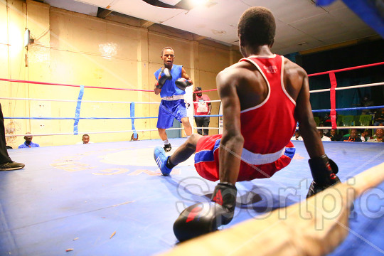 Ambrose Junior (Blue) knocks out Joseph Moses in their minimum weight 48kgs bout during Kenya Boxing Championship at Kaloleni Social Hall in Nairobi on April 01, 2026. Photo/Sportpicha