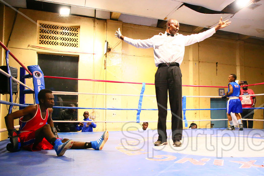 Referee intervene as Ambrose Junior (Blue) knocks out Joseph Moses in their minimum weight 48kgs bout during Kenya Boxing Championship at Kaloleni Social Hall in Nairobi on April 01, 2026. Photo/Sportpicha