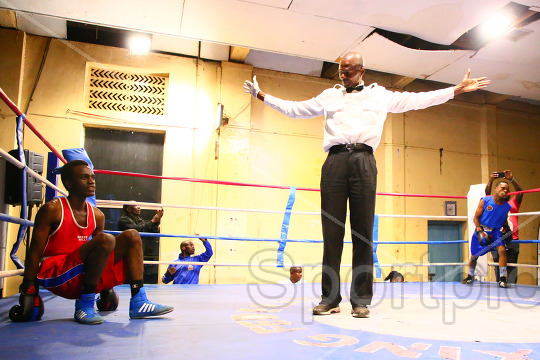 Referee intervene as Ambrose Junior (Blue) knocks out Joseph Moses in their minimum weight 48kgs bout during Kenya Boxing Championship at Kaloleni Social Hall in Nairobi on April 01, 2026. Photo/Sportpicha