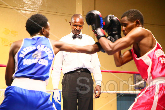 Ambrose Junior (Blue) takes on Joseph Moses in their minimum weight 48kgs bout during Kenya Boxing Championship at Kaloleni Social Hall in Nairobi on April 01, 2026. Photo/Sportpicha