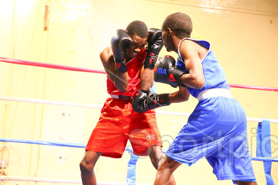 Abdi Mohammed (In Blue) of KDF fight Said Matano of Mombasa in their Minimum weight 48kgs category during Kenya Boxing Championship at Kaloleni Social Hall in Nairobi on April 01, 2026. Photo/Sportpicha