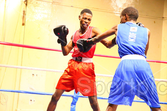 Abdi Mohammed (In Blue) of KDF fight Said Matano of Mombasa in their Minimum weight 48kgs category during Kenya Boxing Championship at Kaloleni Social Hall in Nairobi on April 01, 2026. Photo/Sportpicha
