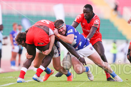 UK Select players tackle Kevin Wekesa of Kenya Shujaa during the 27th edition of the 2025 Safari Sevens Tournament at Nyayo National Stadium on October 11, 2025. Photo/Sportpicha
