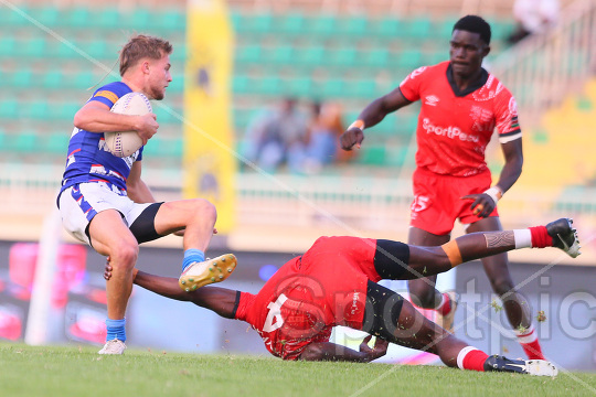 Claux Baptiste (L) of UK Select avoid a tackle from Vincent Onyala of Kenya Shujaa during the 27th edition of the 2025 Safari Sevens Tournament at Nyayo National Stadium on October 11, 2025. Photo/Sportpicha