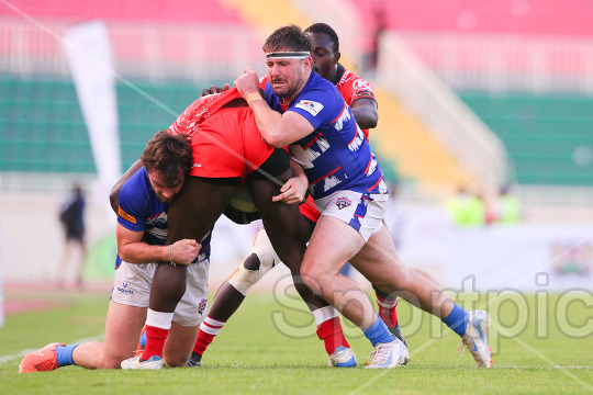 UK Select players tackle Kevin Wekesa of Kenya Shujaa during the 27th edition of the 2025 Safari Sevens Tournament at Nyayo National Stadium on October 11, 2025. Photo/Sportpicha