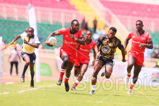 George Ooro (with ball) of Kenya Shujaa outpace Ryan Musumhi of Zimbabwe during the 2025 Safari Sevens Tournament at Nyayo National Stadium on October 12, 2025. Photo/Sportpicha