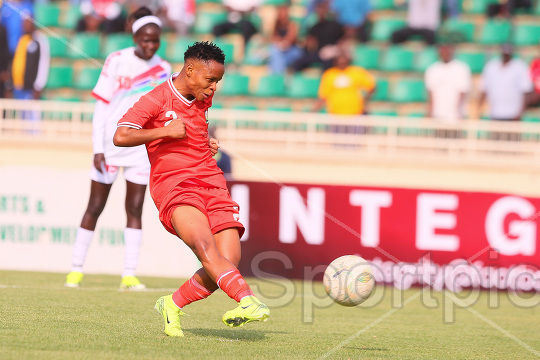 Harambee Starlets striker Mwanalima Adam takes a penalty kick against Gambia during their Women's Africa Cup of Nations 2026 Qualifiers First Leg match at Nyayo National Stadium on October 24, 2025. Photo/Sportpicha