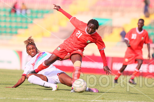 Harambee Starlets midfielder Fasila Adhiambo (R) challenge Isatou Jallow of Gambia during their Women's Africa Cup of Nations 2026 Qualifiers First Leg match at Nyayo National Stadium on October 24, 2025. Photo/Sportpicha