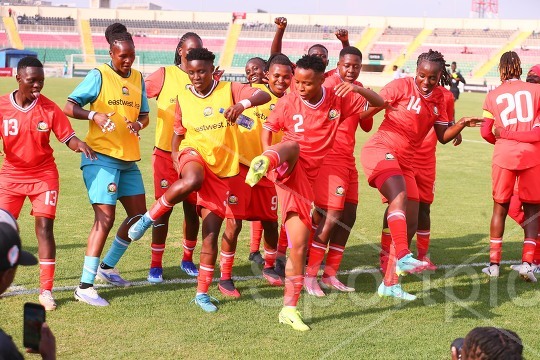 Harambee Starlets players celebrate Mwanalima Adam's (#2) goal against Gambia during their Women's Africa Cup of Nations 2026 Qualifiers First Leg match at Nyayo National Stadium on October 24, 2025. Photo/Sportpicha