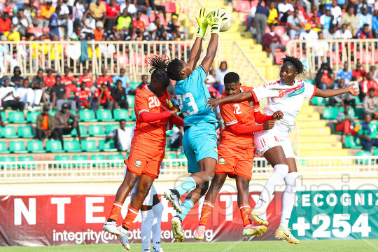 Harambee Starlets Goalkeeper Lilian Onyango Awuor stretches to save against Gambia during their Women's Africa Cup of Nations 2026 Qualifiers First Leg match at Nyayo National Stadium on October 24, 2025. Photo/Sportpicha