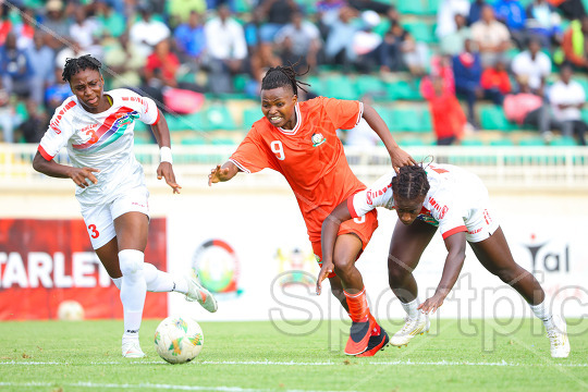 Juwana Colley (L) and Manyima Stevelmans of Gambia tackles Tumiani Nafula (C) of Harambee Starlets during their Women's Africa Cup of Nations 2026 Qualifiers First Leg match at Nyayo National Stadium on October 24, 2025. Photo/Sportpicha