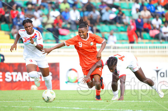 Juwana Colley (L) and Manyima Stevelmans of Gambia tackles Tumiani Nafula (C) of Harambee Starlets during their Women's Africa Cup of Nations 2026 Qualifiers First Leg match at Nyayo National Stadium on October 24, 2025. Photo/Sportpicha