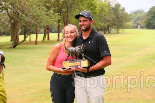 Jarvis Casey from South Africa celebrates with his girlfriend after winning the Magical Kenya Open Golf Tournament presented by Absa at Karen Country Club on February 22, 2026. Photo/Sportpicha