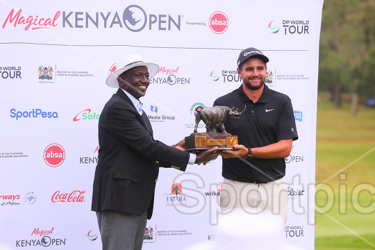President William Ruto awards Jarvis Casey from South Africa after winning the Magical Kenya Open Golf Tournament presented by Absa at Karen Country Club on February 22, 2026. Photo/Sportpicha