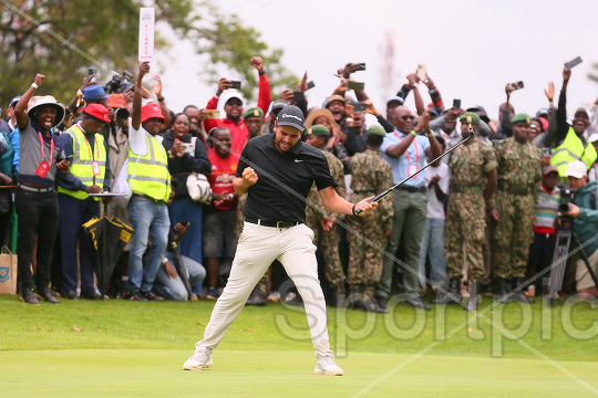 Jarvis Casey from South Africa celebrates winning the Magical Kenya Open presented by Absa at Karen Country Club on February 22, 2026. Jarvis carded 25 under par 255 to win the 57 edition of the tournament. Photo/Sportpicha