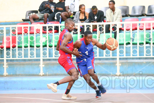 Fazul Khamisi (Left) of Snipers tackle Frank Mwinzi of MAB during their Kenya Basketball Federation league match at Nyayo Stadium Indoor gymnasium in Nairobi on March 28, 2026. MAB won 70-61. Photo/Sportpicha
