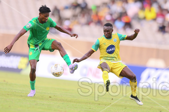 Lesley Owino (L) of Nairobi United FC contest for the ball with Christian Balako of AS Maniema Union from DR Congo fight for the ball during their CAF Confederation Cup 2025/26 Quarter-final at Kasarani Stadium in Nairobi on November 31, 2025. Photo/Sportpicha
