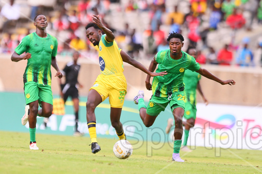 Enock Machaka (Left) of Nairobi United FC contest for the ball with Chadoma Ozome of AS Maniema Union from DR Congo fight for the ball during their CAF Confederation Cup 2025/26 Quarter-final at Kasarani Stadium in Nairobi on November 31, 2025. Photo/Sportpicha