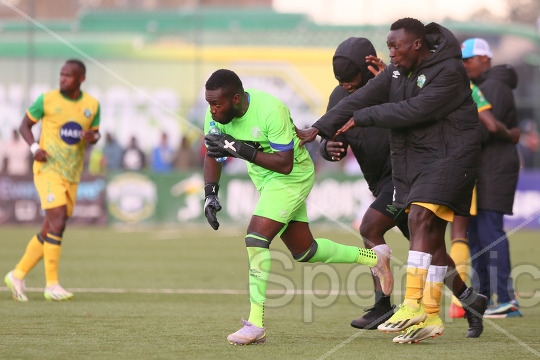 Nairobi United FC goalkeeper Kevin Oduor celebrate with players on bench after his team scored an equalizer against Gor Mahia FC during their Sportpesa Premier League match at Dandora Stadium in Nairobi on December 21, 2025. Photo/Sportpicha
