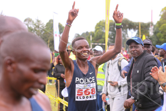 Daniel Simiu Ebenyo celebrates winning the 10KM Senior Men race during the 2025 Kenya National-Cross Country Championships held at Eldoret Sports Club on October 25, 2025. Photo/Sportpicha