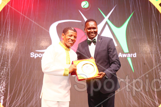 SOYA patron Paul Tergat present an award to Ethiopian former long-distance track Haile Gebrselassie during the 22nd Edition of Sports Personality of the Year Awards at Uhuru Gardens in Nairobi on April 10, 2026. Photo/Sportpicha