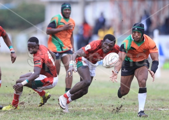 Geoffrey Okwatch L and Isaac Njoroge C of Kenya contest for ball with Edward Mumba of Zambia of Kenya contest for ball with Edward Mumba of Zambia during return leg of Victoria Cup match at at RFUEA grounds on August 24, 2019. PhotoStafford Ondegowww.sportpicha.com