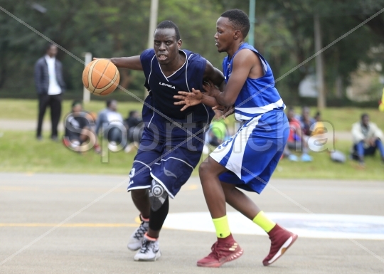 Guy Morel R of Strathmore University tackle Mathews Obiero of JKUAT during their Kenya Basketball Federation 1st leg fixture at University of Nairobi Grounds on July 17, 2021. Strathmore University won 62-23.PhotoEvans OdariSportpicha