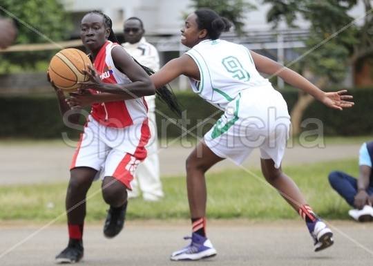 Purity Wanjiku R of Multi-Media University MMU tackle Caren Atieno of Technical University of Kenya TUK during their Kenya Basketball Federation 1st leg fixture at University of Nairobi Grounds on July 17, 2021. PhotoEvans OdariSportpicha