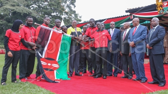 President Uhuru Kenyatta presents the National flag to the Rio 2016 Olympics Games National Team at State House, Nairobi