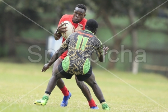Hannington Mmbaka L of Impala Saracens tackled by Chrispin Onyango of Top Fry Nakuru during their Kenya Cup Fixture at Impala Club in Nairobi on July 10, 2021. PhotoEvans OdariSportpicha