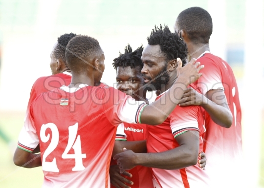 Harambee Stars striker Elvis Rupia celebrates with teammates after scoring against South Sudan during their Friendly match against Harambee Stars players at Nyayo national stadium on March 13, 2021. Kelly AyodiSportpicha
