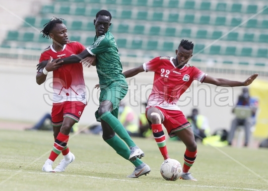 Harambee Stars John Macharia Left and Abdallah Hassan Right take on Rehan Angier of South Sudan during their Friendly match against Harambee Stars players at Nyayo national stadium on March 13, 2021. PhotoEvans OdariSportpicha