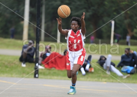 Phoebe Kandagor of Technical University of Kenya TUK passes ball against Multi-Media University MMU during their Kenya Basketball Federation 1st leg fixture at University of Nairobi Grounds on July 17, 2021. PhotoEvans OdariSportpicha