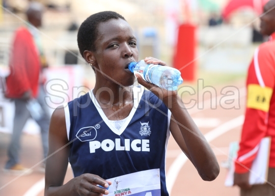 Agnes Tirop quenches thrisrt after winning the 10,000KM women final during Day Two of the National Athletics Championships 2019 at Nyayo national stadium in Nairobi on August 21, 2019. PhotoStafford Ondegowww.sportpicha.com