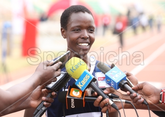 Agnes Tirop addresses the media after winning the 10,000KM women final during Day Two of the National Athletics Championships 2019 at Nyayo national stadium in Nairobi on August 21, 2019. PhotoStafford Ondegowww.sportpicha.com