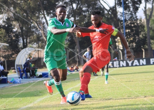 Gor mahia FC captain Kenneth Muguna L contest for the ball with his Bandari FC counterpart Felly Mulumba during their Super Cup final match at Kenyatta stadium in Machakos on August 18, 2019. Gor Mahia FC won 1-0. PhotoRodgers Odhiambowww.sportpicha.com