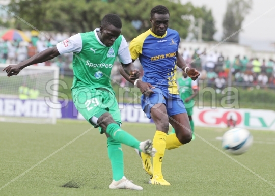 Gor Mahia Innocent Wafula gets the ball away from Western StimaBaron Okech in their sport pesa premier league at the Moi stadium Kisumu. Gor Mahia won 1-0.... PhotoTOM OGWEL