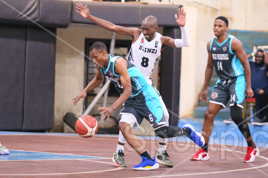 Victor Bosire (L) of Umoja Basketball tussle for ball with Elvis Mwalo Akoyi of Ulinzi Warriors during their East Africa Basketball Championships Cup half Finals at Nyayo National Stadium on October 09, 2025. Ulinzi Warriors won 68-64. Photo/Sportpicha