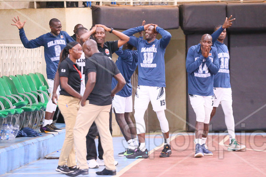 Ulinzi Warriors players and technical bench react to a missed chance against Umoja Basketball during their East Africa Basketball Champions Cup half Finals at Nyayo National Stadium on October 09, 2025. Photo/Sportpicha